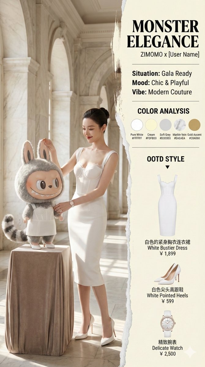 Mantieni tratti del viso, capelli e proporzioni della persona reale mentre vesti Labubu, Zimomo o Tycoco con mini haute couture coordinata. Scala accessori e preserva texture in peluche o vinile.