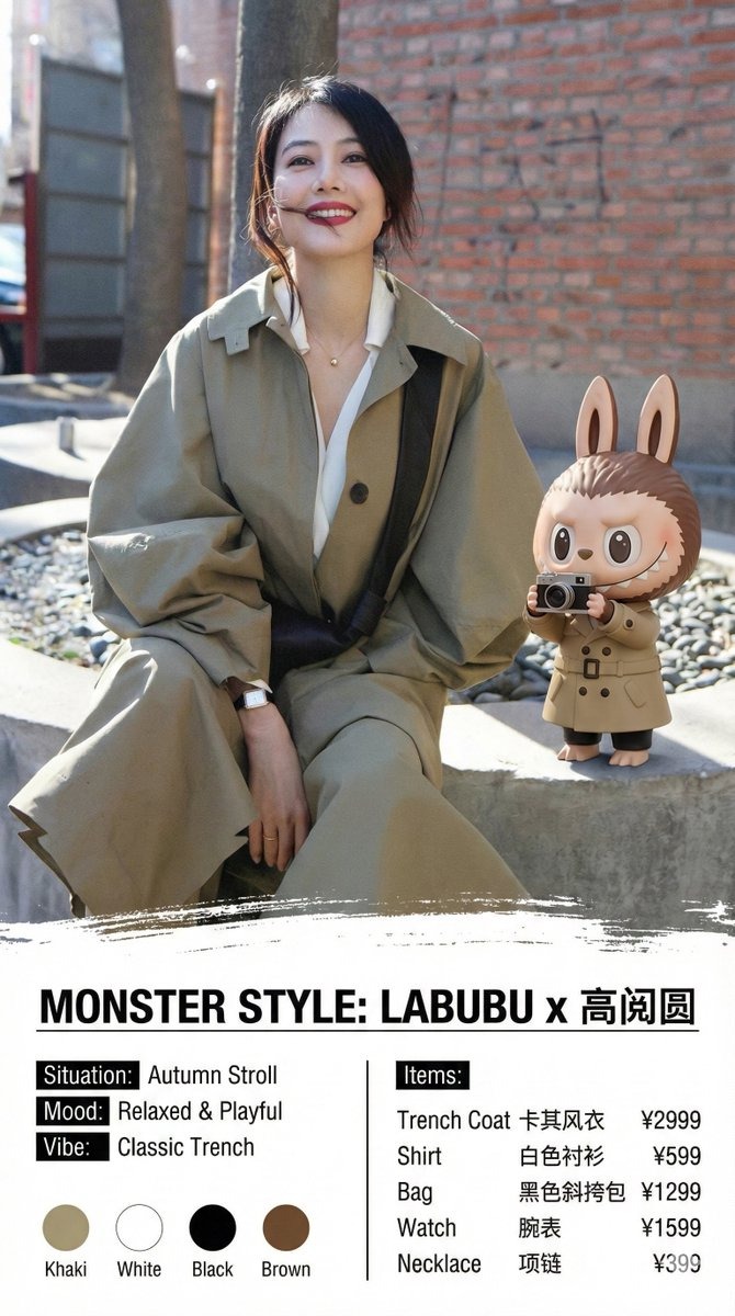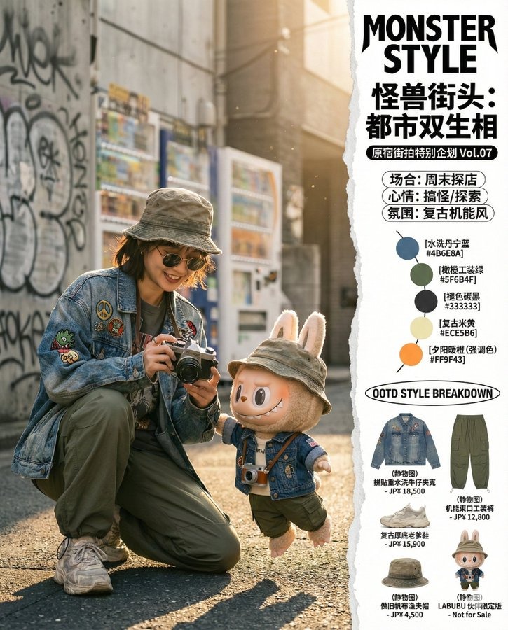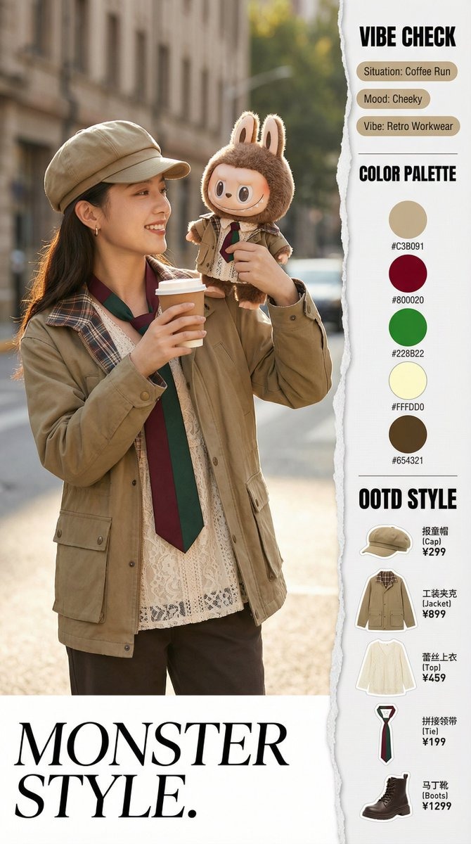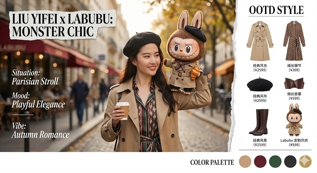 Ritratto ravvicinato di umano + texture peluche Labubu; identità bloccata; palette circolare e copy OOTD.