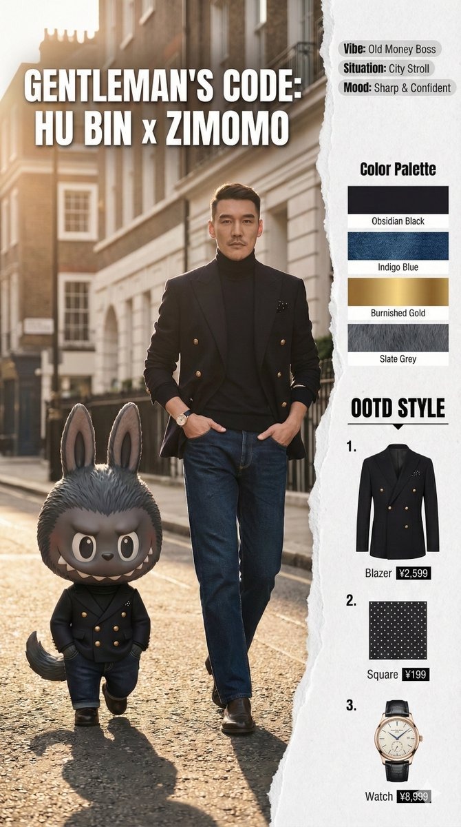 "Zimomo in un abito antracite sartoriale con cravatta sottile, seduto sulla spalla dell'utente. Espressione umana sicura e naturale; luce sincronizzata. Corrimano in acciaio spazzolato, bokeh, tipografia 'MONSTER STYLE'."