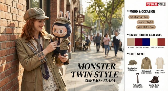 Cura un editoriale fotografico fotorealistico che unisce una persona reale (identità bloccata) ai personaggi The Monsters di Pop Mart. Vestili come partner di stile, sincronizza le luci e mantieni le texture originali dell'IP.