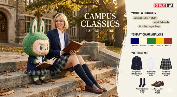 "Labubu giocoso seduto sulla messenger bag mentre l'umano gli sistema la sciarpa. Palette varsity retrò (borgogna, verde bosco, crema) con striscia di cinque colori. Layout magazine pulito che separa foto e lista capi."