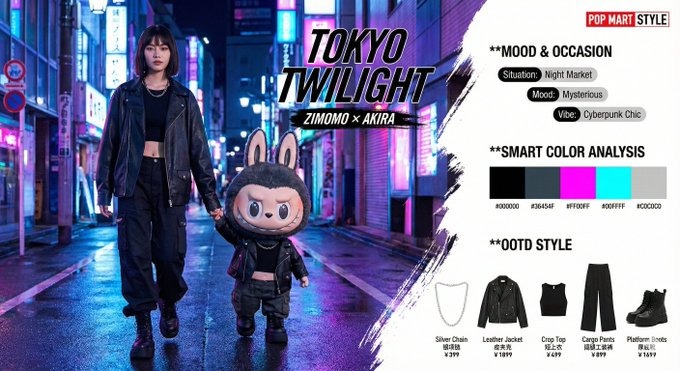 Labubu per look giocosi, Zimomo per sartoria affilata, Tycoco per struttura avantgarde. Cita pelliccia o vinile per mantenere il feeling dell'IP.