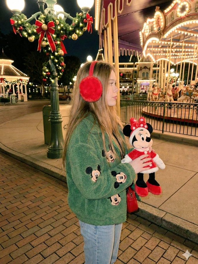 Lock identity, skin tone, and cozy wardrobe details while layering cinematic bokeh, string lights, and fireplace warmth for premium Christmas storytelling.