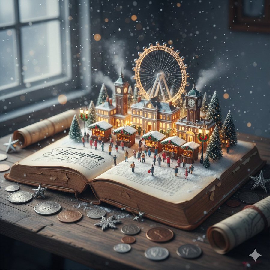 Mix cozy interiors with crisp outdoor moments: cabins, markets, and snowy forests with controlled particles, leading lines, and balanced warm-cool contrast.