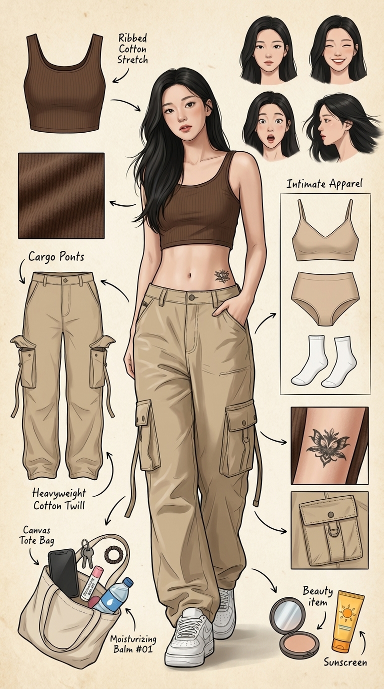 Include 'lifestyle items' or 'bag contents' that hint at the character's daily routine and personality.